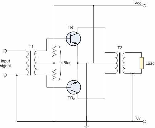 via the centre-tap of the input transformer, thus the transistors are no longer biased at the zero