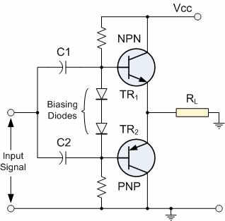 divider circuit or diode biasing this crossover distortion can be greatly reduced or even