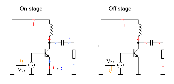 I2 (blue) also through the transistor. The I2 current passes the resistor (antenna) which radiate