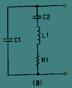 L1, and resistor R1 in Fig. 2 represent the electrical equivalent of the quartz crystal in Fig. 1.